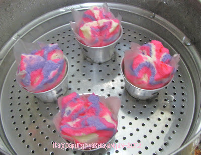 4. Panaskan kukusan/dandang/langseng hingga benar-benar sudah panas. Masukkan adonan warna ungu kedalam loyang, lalu kukus hingga matang selama 15 menit. Buka kukusan, tuangkan adonan yang berwarna putih diatas adonan warna ungu, kukus kembali selama 15 menit. Buka kukusan lagi, tuangkan adonan warna merah muda/pink dan kukus hingga matang selama 30 menit...agar seluruh lapisan kue matang sempurna. Jangan lupa bungkus tutup kukusan dengan lap/serbet tebal, agar uap air di dalam kukusan tidak jatuh ke atas kue.